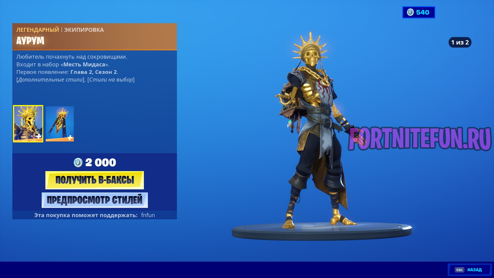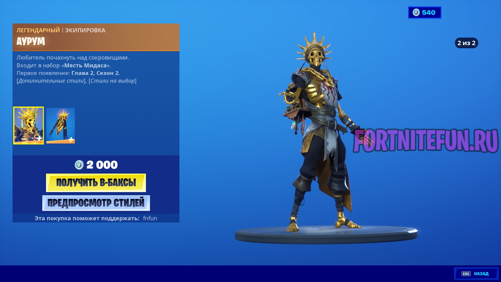 После появления дополнительного стиля, скин Аурум просто засверкал в глазах игроков. И догадок касательно его получения было много — то это секретный скин, то часть набора, то предмет для магазина. Последнее предположение было верней всего — Скин Аурум (Oro) продается во внутриигровом магазине фортнайт за 2000 В-баксов.
