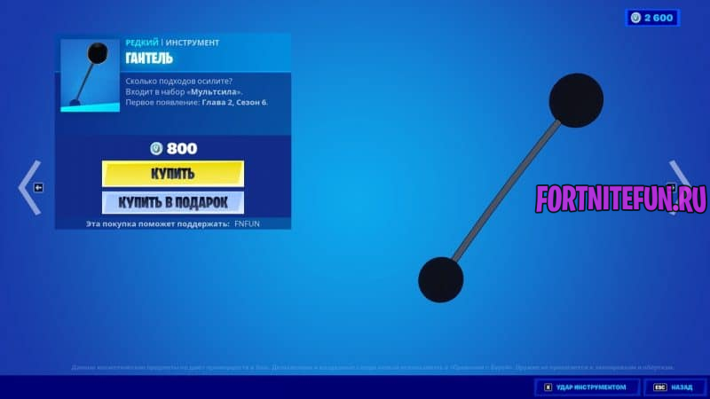 Скин стоит 1400 В-Баксов, в комплекте с ним идёт эмоция «Ретромышцы» и рюкзак «Мультитунец». Новинками также стали кирка «Гантель» и музыка «Вступайте в игру» стоимостью 800 и 200 В-Баксов соответственно. Все предметы можно приобрести набором со скидкой за 1700 В-Баксов. Как обычно, в подарок вы получите экран загрузки.