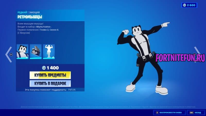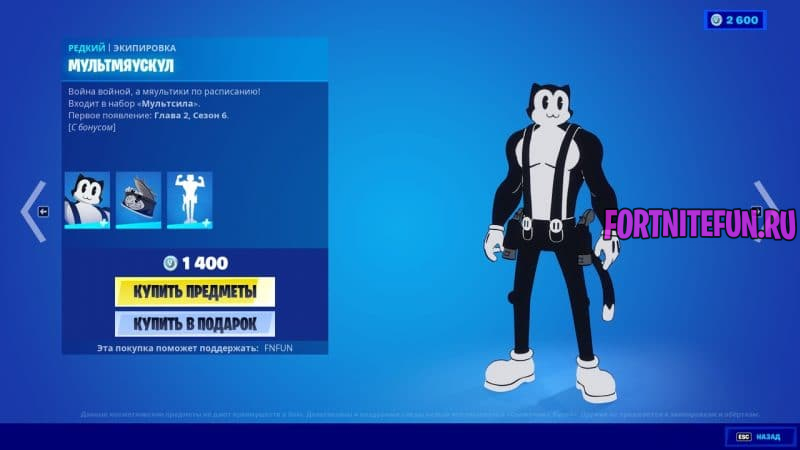 Мяускул с рисовкой 20-30-х годов Диснея, имея незамысловатое, но говорящее само за себя название — «Мультмяускул», уже попал в магазин предметов фортнайт.