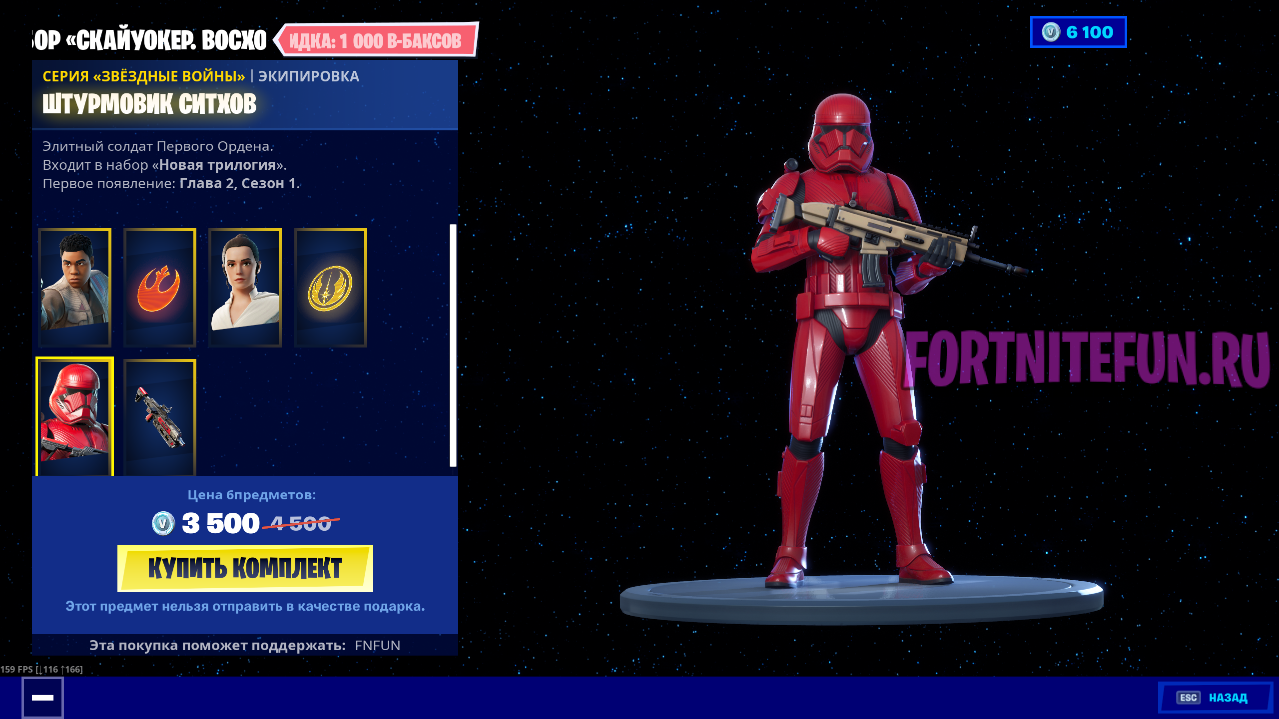 Стоимость набора, состоящего из 3 скинов Рей, Финн и Штурмовик Ситхов и 3 рюкзаков к ним обойдется Вам в 3500 В-баксов (цена, по мнению эпиков, снижена аж на 1000 В-баксов! Хватайте скидку!).