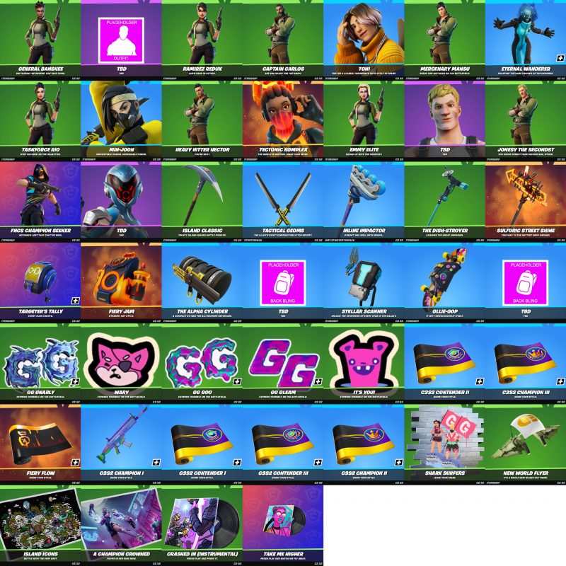 Скин Тони входит в набор PvE; а Герой мини-чемпионата, Лавовая художница и дефолтные скины 2 главы образуют бандлы: