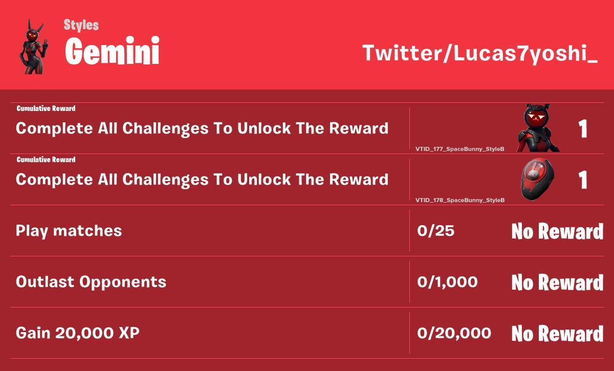 Скин Gemini, который попал в файлы игры ещё в апреле, но так и не вышел обзавёлся новой информацией. В сеть попали испытания для данного скина. Вот эти испытания: