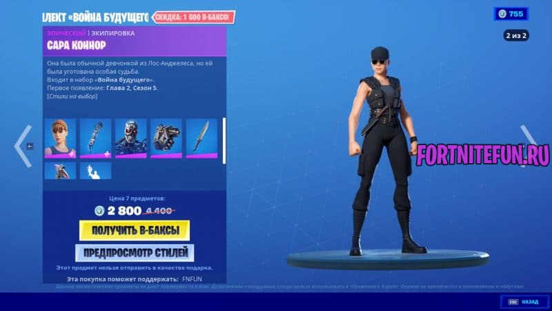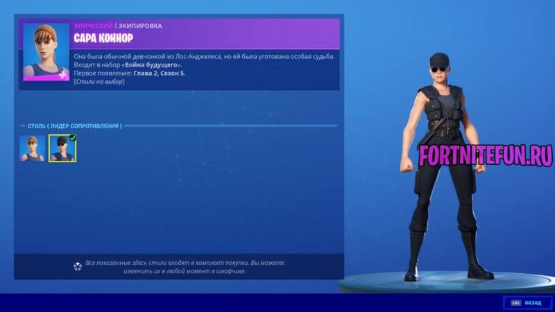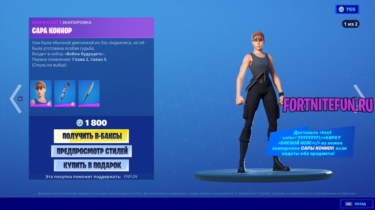 Сару Коннор в эпическом качестве можно приобрести за 1800 В-баксов. У скина два стиля, а из аксессуаров — одинокий рюкзак и кирка в виде ножа.