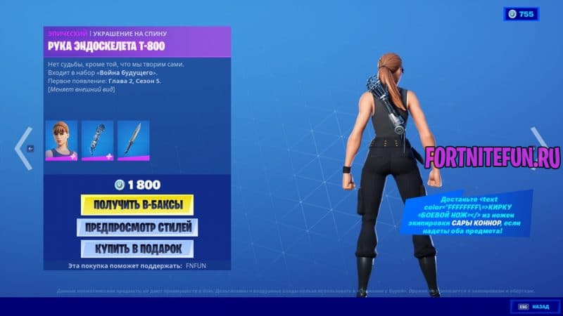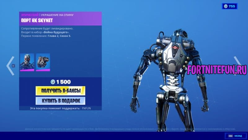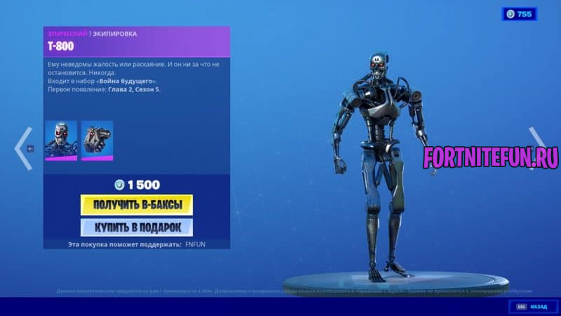 Терминатор, а именно Т-800, стоит 1500 в-баксов. Продается он с рюкзаком и не имеет дополнительных стилей.