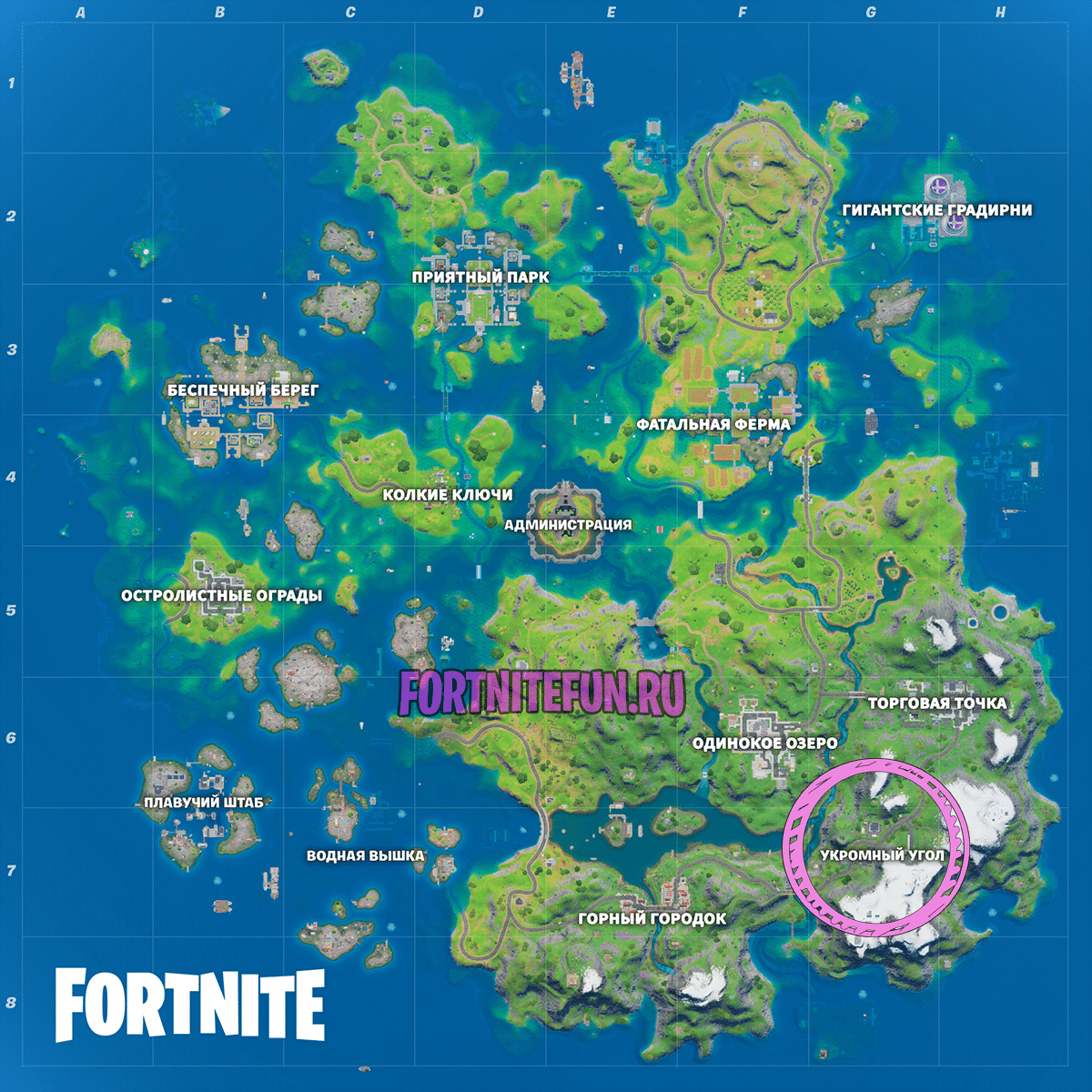 Укромный Угол (Catty Corner) — локация, которая появилась на карте фортнайт после обновления 13.00. Укромный Угол находится юго-восточнее Одинокого озера и юго-западнее Торговой точки.