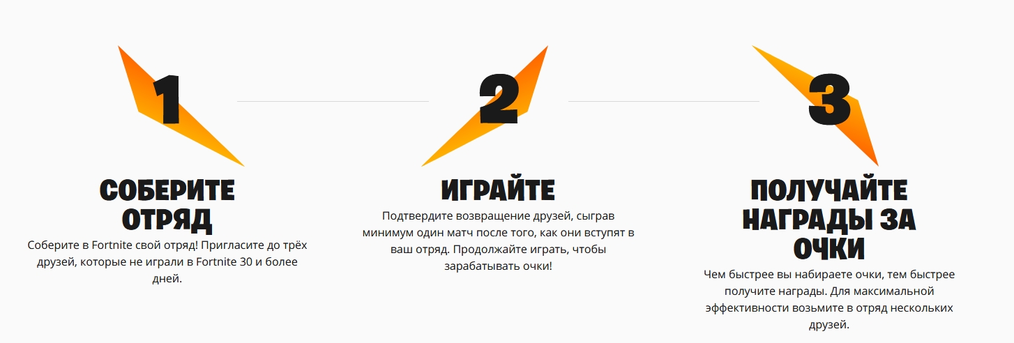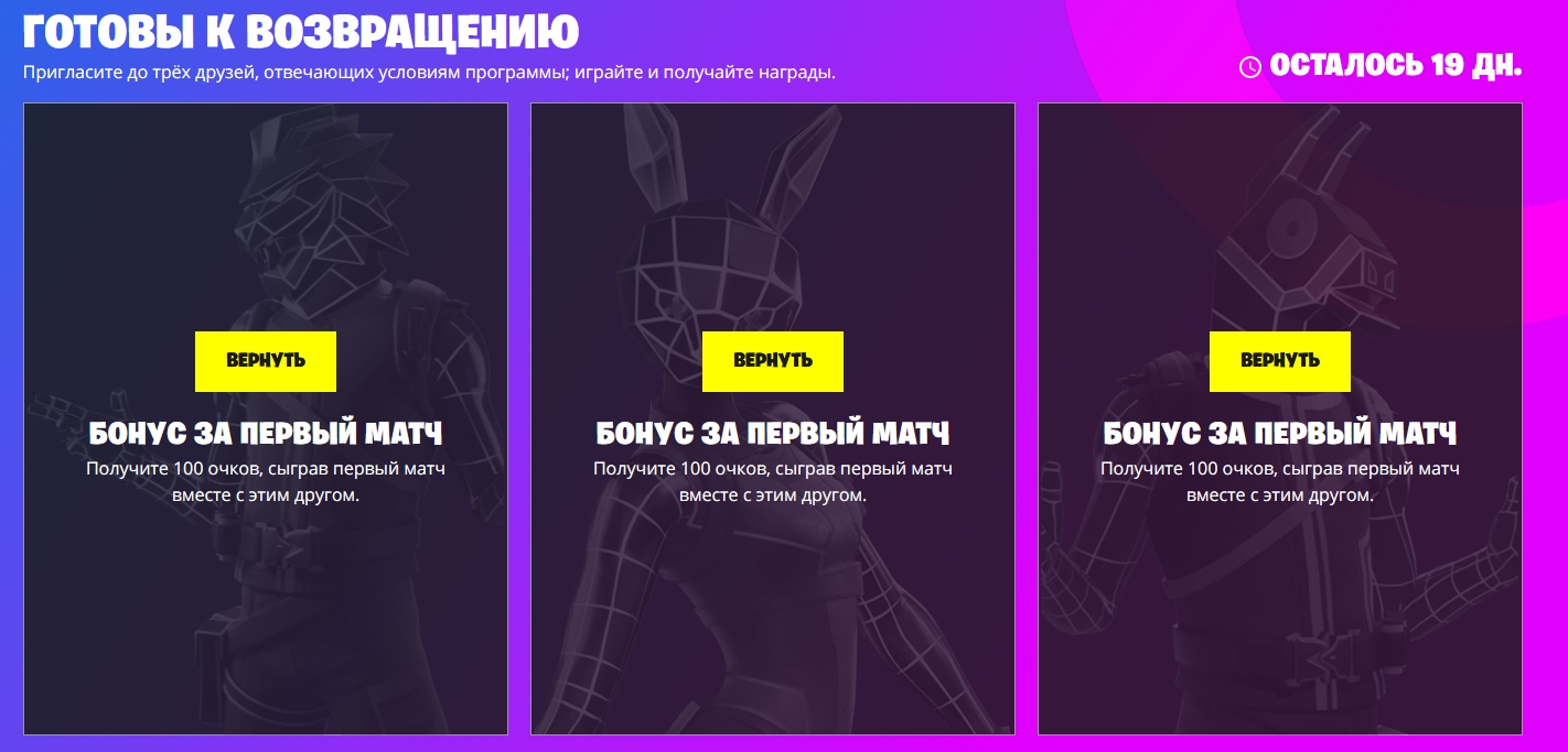 Теперь вы можете собрать до трех друзей, которые не играли 30 дней в фортнайт или более, в свой отряд, чтобы вспомнить былое. За каждого возвращенного друга фортнайт начислят вам 100 очков, необходимых для получения наград. Также, очки начислят и за матчи. За первый матч, сыгранный с одним из таких друзей, вы получите 100 очков, а за каждый следующий – по 10.