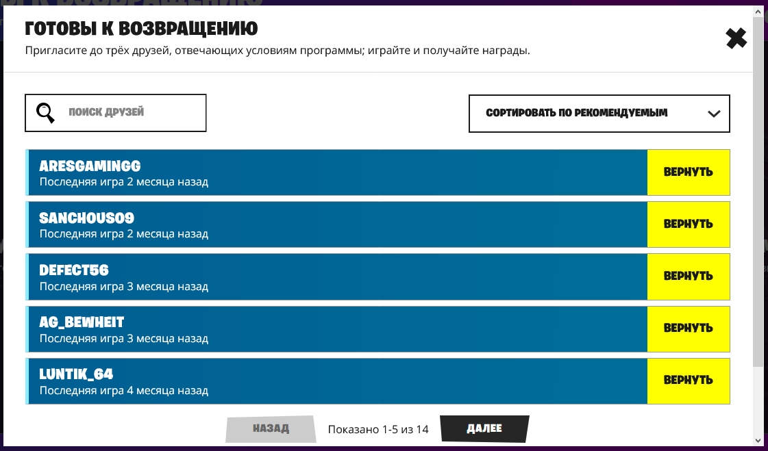 Чтобы участвовать в раздаче призов, вам необходимо зайти на сайт (rebootafriend.fortnite.com), ввести свои данные и нажать «вернуть». Из списка выберите подходящего друга, а затем скооперируйтесь с ним для получения очков, ведь они необходимы для подарков.