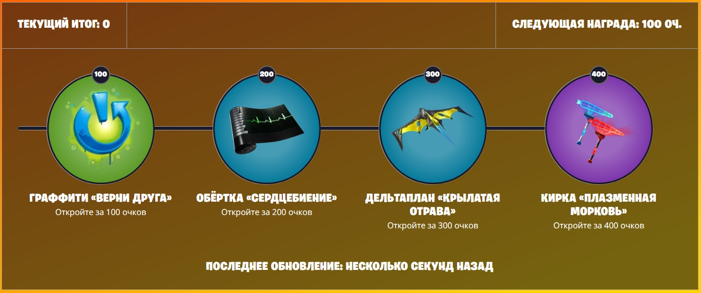 А теперь о приятном, поговорим о наградах. За 100 очков вы получите граффити «Верни друга», за 200 – обертку «Сердцебиение», за 300 – неплохой дельтаплан «Крылатая отрава», а за целых 400 очков – кирку в двух стилях «Плазменная морковь.»
