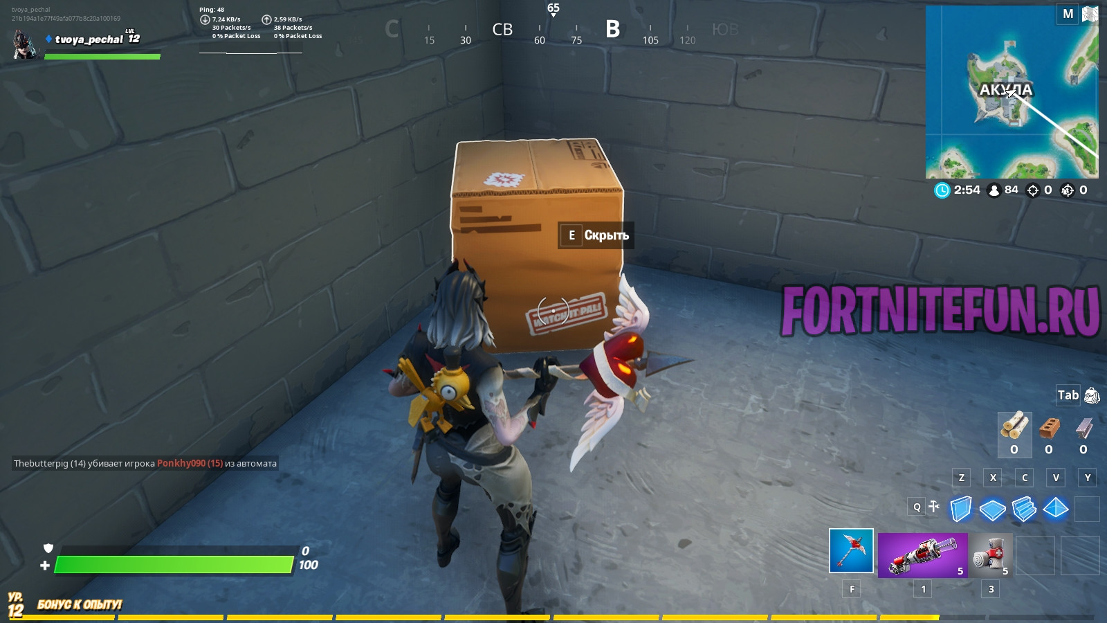 Наследие Кодзимы добралось и до фортнайта, теперь игра действительно гениальна. Если Вы не знали, то прятаться в коробку, это локальный мем игры Метал Гир Солид. Но суть не в этом, новый предмет для маскировки, коробка — является частью испытания. Вам нужно разблокировать скин Мяускула, найти коробку и забраться в неё. Как только вы это сделаете — достижение будет получено.