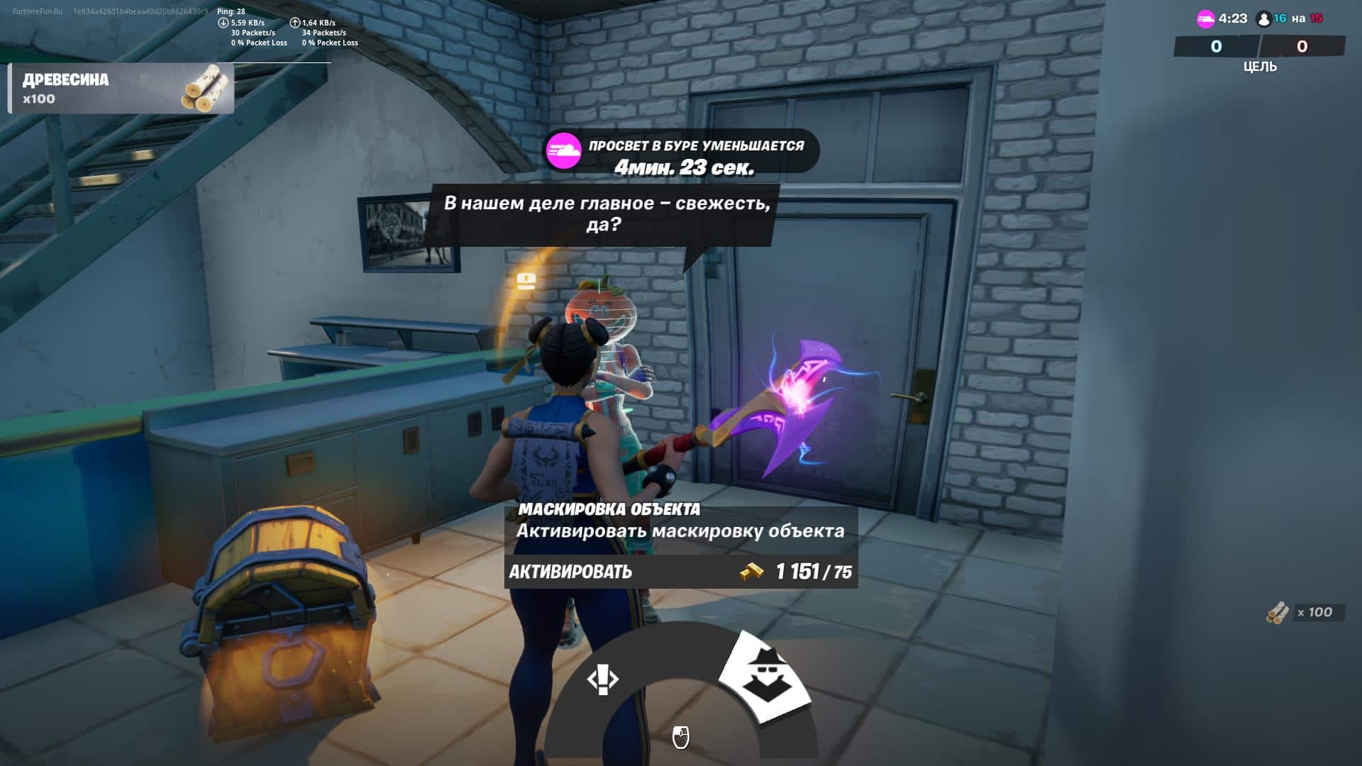 Для нанесения урона холодным оружием — дучше находиться в зоне и бить киркой по постройкам, которые оставили враги.