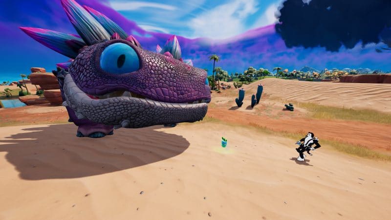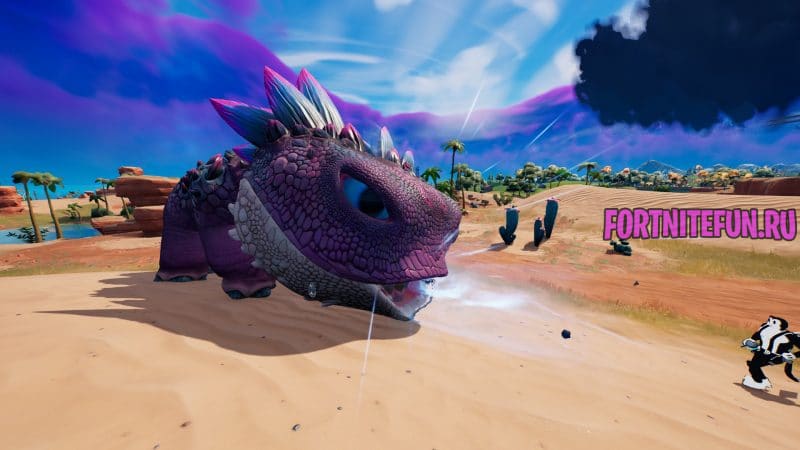 Как только окажитесь у персонажа на юге карты, смотрите по сторонам — динозавр очень большой, и вы без труда увидите его при приземлении. Покупаем у персонажа ягоды и бежим в ту сторону, где вы видели булочку. После того, как вы подбежите к ней очень близко — выбирайте предмет в инвентаре и, зажав кнопку прицеливания, бросаем кломбнику перед лицом кломба (выбираем предмет в инверторе, зажимаем правую кнопку мыши, направляем стрелку в динозавра и отпускаем). Динозавр втянет фрукт, поменяет цвет и возможно что-то вернёт вам взамен. Но это уже не так важно, ведь задание вы выполнили.
