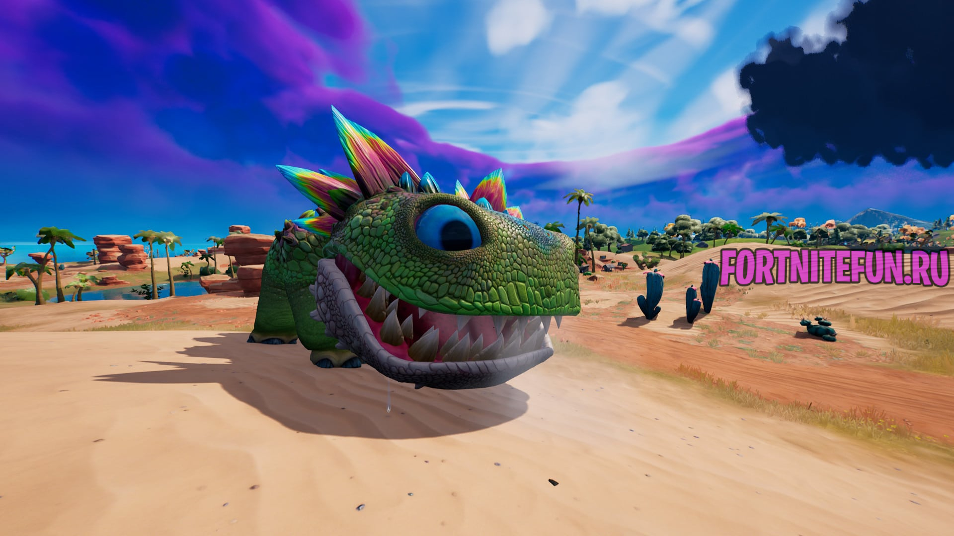 Как только окажитесь у персонажа на юге карты, смотрите по сторонам — динозавр очень большой, и вы без труда увидите его при приземлении. Покупаем у персонажа ягоды и бежим в ту сторону, где вы видели булочку. После того, как вы подбежите к ней очень близко — выбирайте предмет в инвентаре и, зажав кнопку прицеливания, бросаем кломбнику перед лицом кломба (выбираем предмет в инверторе, зажимаем правую кнопку мыши, направляем стрелку в динозавра и отпускаем). Динозавр втянет фрукт, поменяет цвет и возможно что-то вернёт вам взамен. Но это уже не так важно, ведь задание вы выполнили.