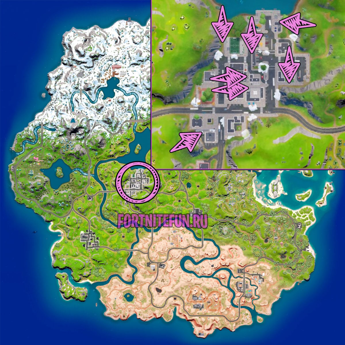В данном задание вам необходимо за один матч посетить 5 локаций, названия которых присутствуют на карте. Локации в данном сезоне имеют почти одинаковую плотность и выделить какой-то районе где проще всего выполнить задания — я не могу. Но самое важное в данном задание — это скорость передвижения по карте. Поэтому приземляйтесь туда, где можно найти руки человека паука и с помощью паутины быстро посетите 5 разных районов.