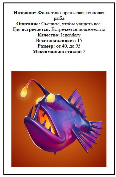 Тепловые рыбы при поедании включают встроенный в мозг тепловизор, а как они выглядят вы можете увидеть ниже. Данная рыба ловится повсеместно, поэтому прилетайте к точкам спавна удочек или же к морозилкам и старайтесь добыть данную рыбу.