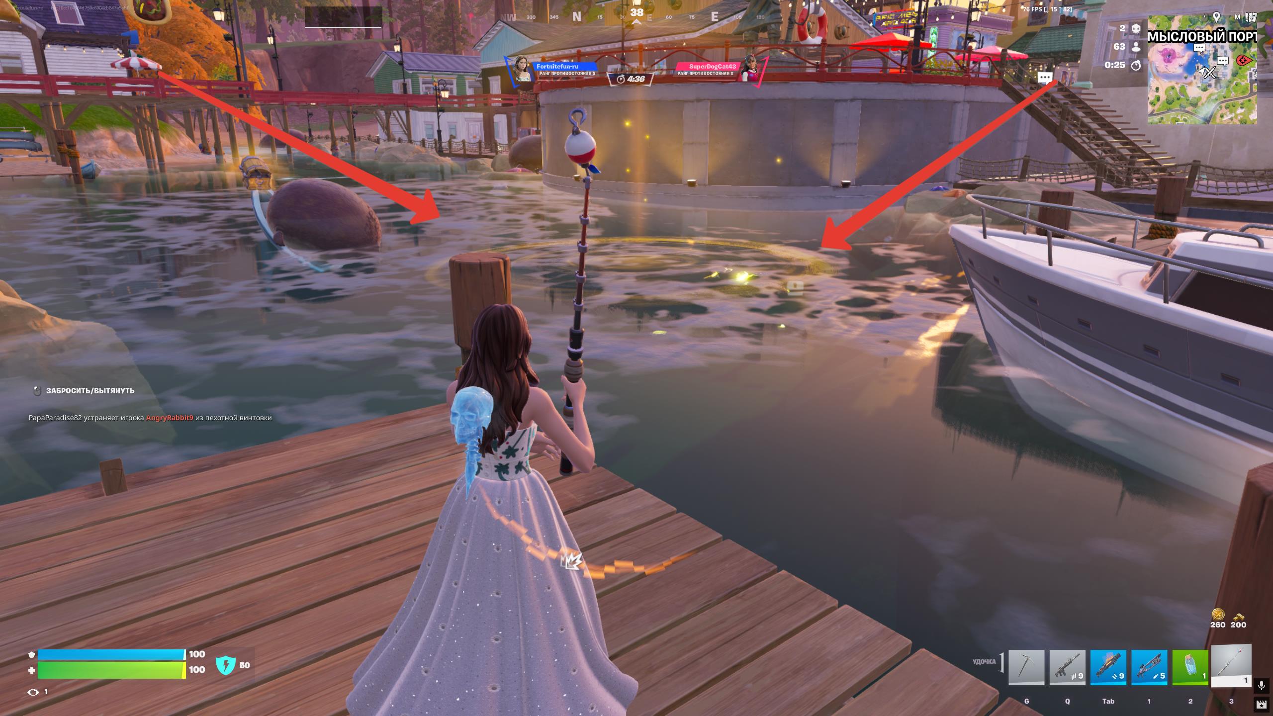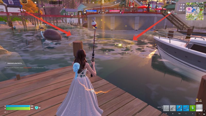 Вам нужно заниматься привычным для фортнайта действием, но в особых местах. для рыбалки подойдут лишь водовороты, которые окрашены в золотой цвет (как на изображение).
