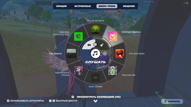 Вызвав колесо эмоций, перейдите во вкладку с джем-треками. Выберите любой трек, и он начнет проигрываться для вас, словно радио в машине. По центру расположен переключатель, позволяющий либо только слушать трек, либо сыграть его самостоятельно.